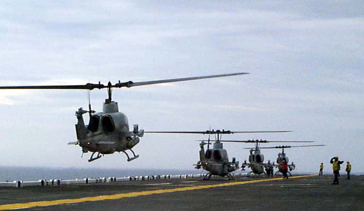 U.S. Marine Corps AH-1W Super Cobra helicopters land aboard the