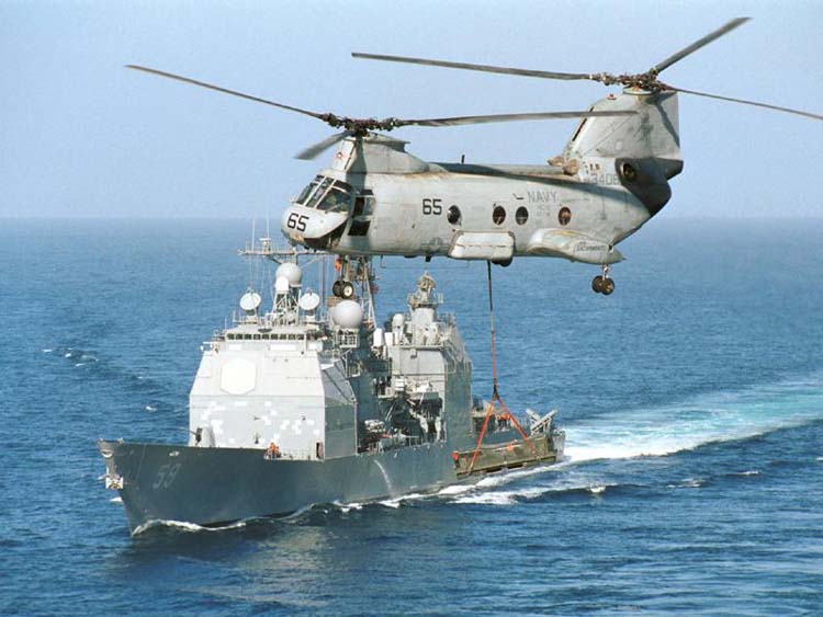 Squadron One One (HC-11) delivers ordnance to the aircraft carrier.