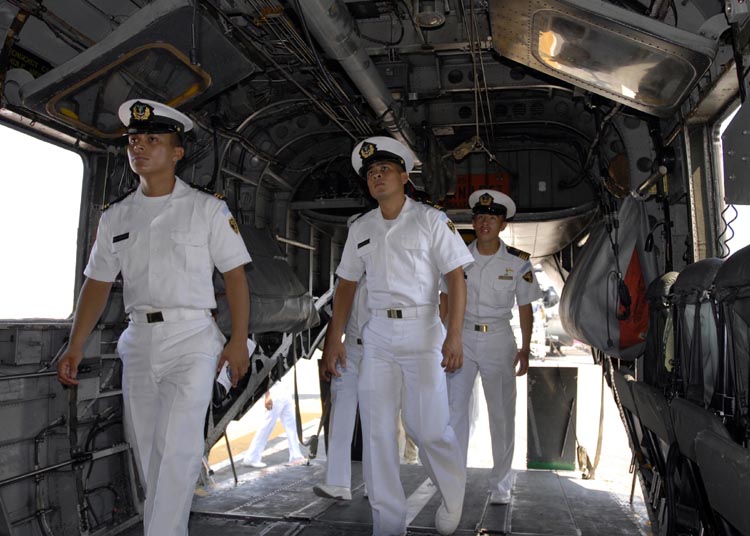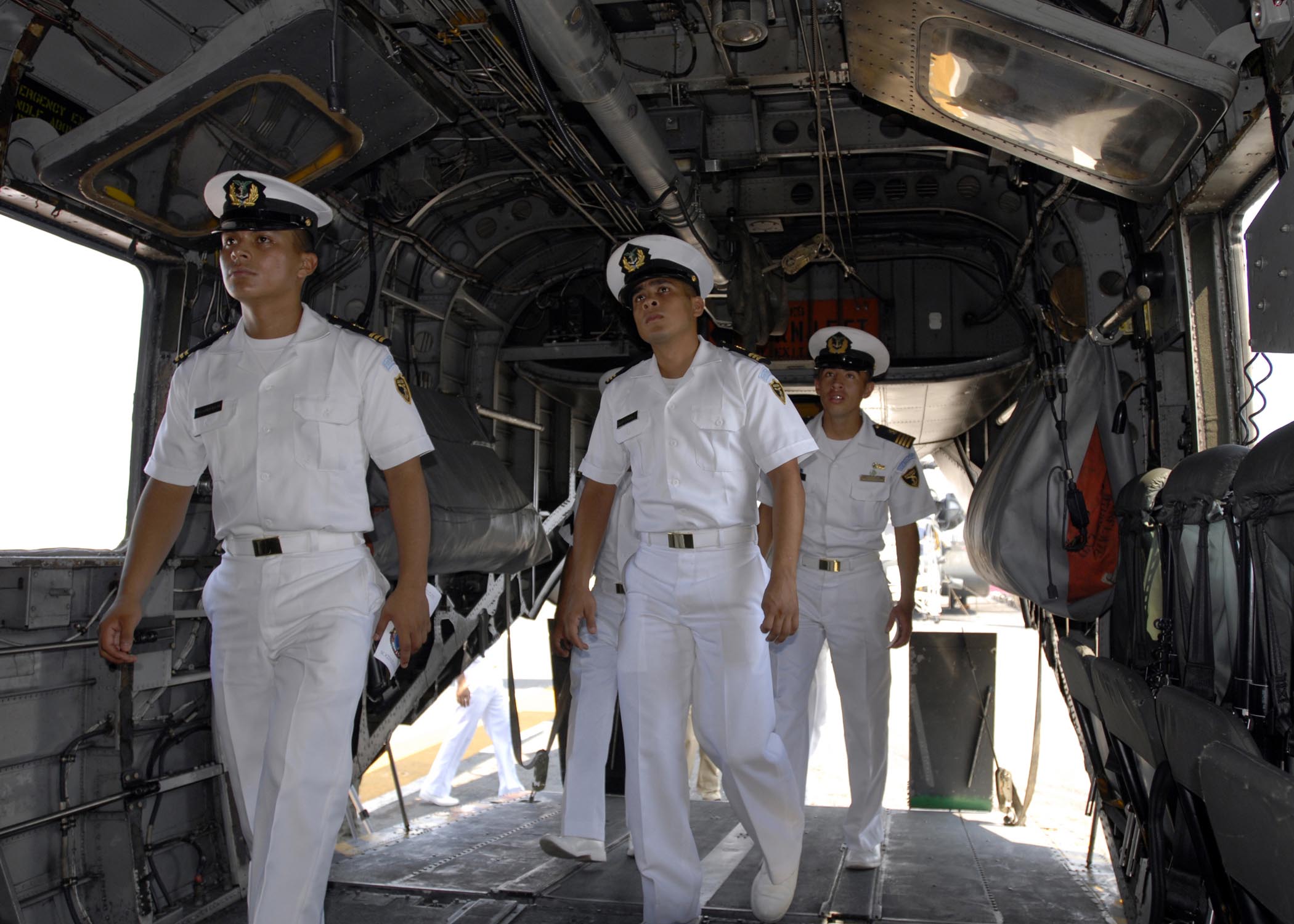 GUATEMALA (May 7, 2008) -- Guatemalan navy cadets walk through an MH-53E Sea Dragon during a tour of the amphibious assault ship USS Boxer (LHD 4). Boxer is deployed in support of the Pacific phase of Continuing Promise 2008, a two-month equal partnership mission designed to combine partner nation and U.S. relief capabilities to demonstrate the lasting bonds and shared interests among neighbors.  U.S. Navy photo by Mass Communication Specialist Seaman Matthew Jackson (Released)