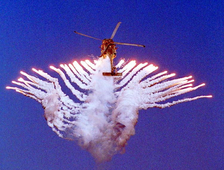 An SH-60 Sea Hawk helicopter fires flares during an air power