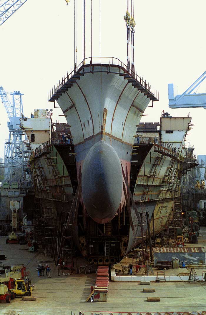 Newport News, Virginia (Mar. 16 2000) -- The lower bow unit of the aircraft carrier Ronald Reagan (CVN 76) is lowered into place at the Northrop Grumman Newport News Shipbuilding facility.  (RELEASED)