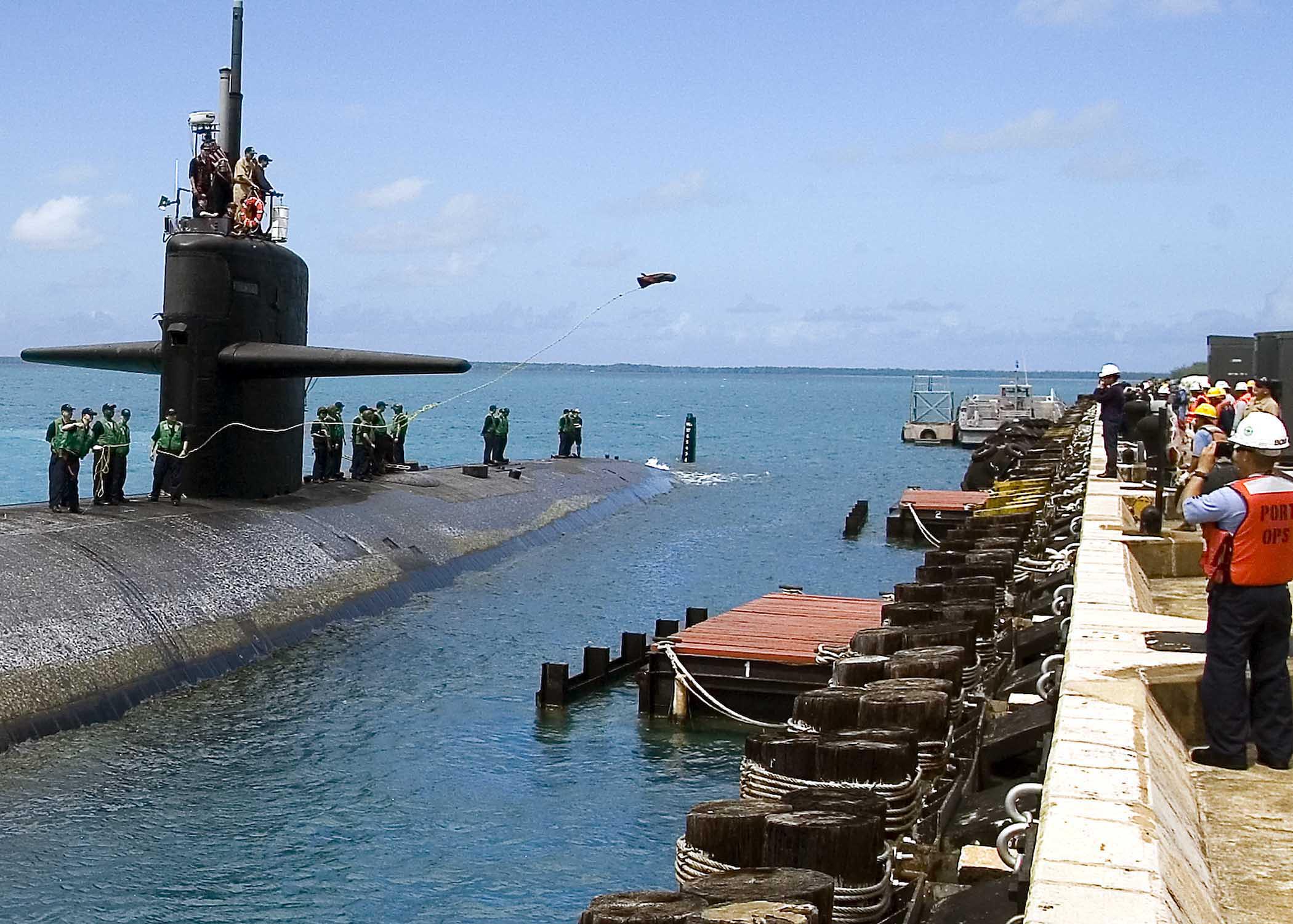 submarine USS Dallas (SSN 700) and contractors from DG-21 help moor the
