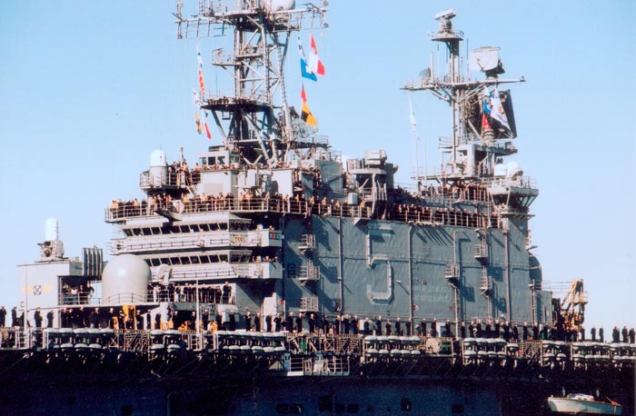Sailors and Marines of the 15th MEU(SOC) man the rails of the USS Peleliu as it pulls into San Diego Harbor March 4.  The service members were among the first to respond to September's terrorist attacks. (RELEASED)