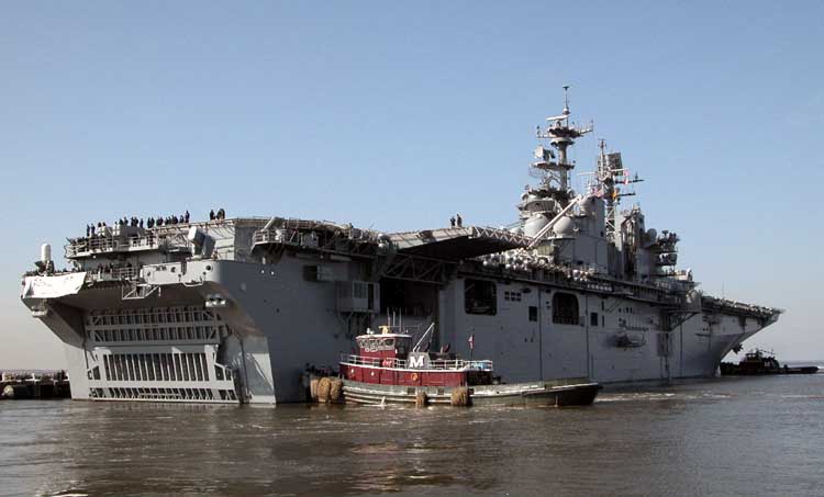 Naval Station Norfolk, Va. (Mar. 4, 2003) -- The amphibious assault ship USS Iwo Jima (LHD 7) is guided away from the pier by a tug boat as she deploys on her maiden voyage. The Iwo Jima Amphibious Ready Group (ARG) is deploying in support of Operation Enduring Freedom.  U.S. Navy Photo by Photographer's Mate 2nd Class Benjamin Hammond.  (RELEASED)