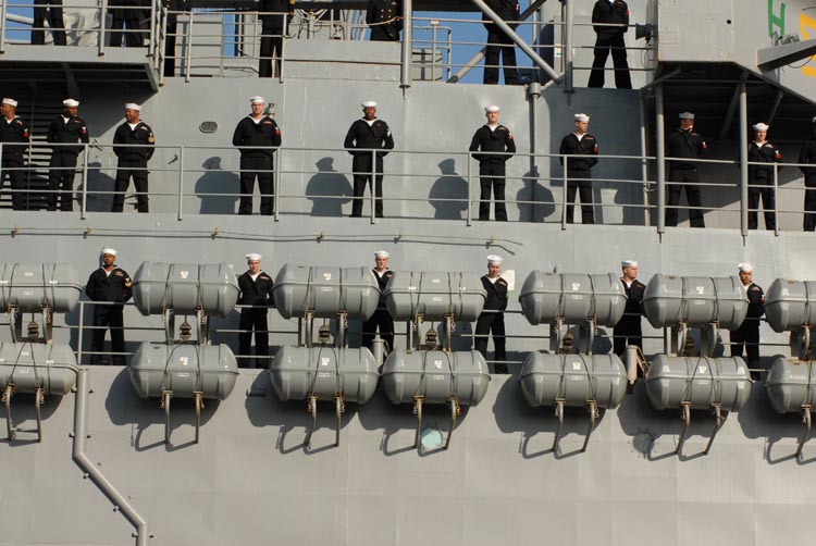 Norfolk, Va. (Jan. 4, 2007) -- Sailors aboard amphibious transport dock ship USS Shreveport (LPD 12) man the rails as the ship departs Naval Station Norfolk. Shreveport is part of the Bataan Expeditionary Strike Group (ESG) and is deploying to conduct maritime security operations in support of the ongoing rotation of forward deployed forces. U.S. Navy photo by Mass Communication Specialist Seaman Apprentice Matthew R. Bookwalter (RELEASED)