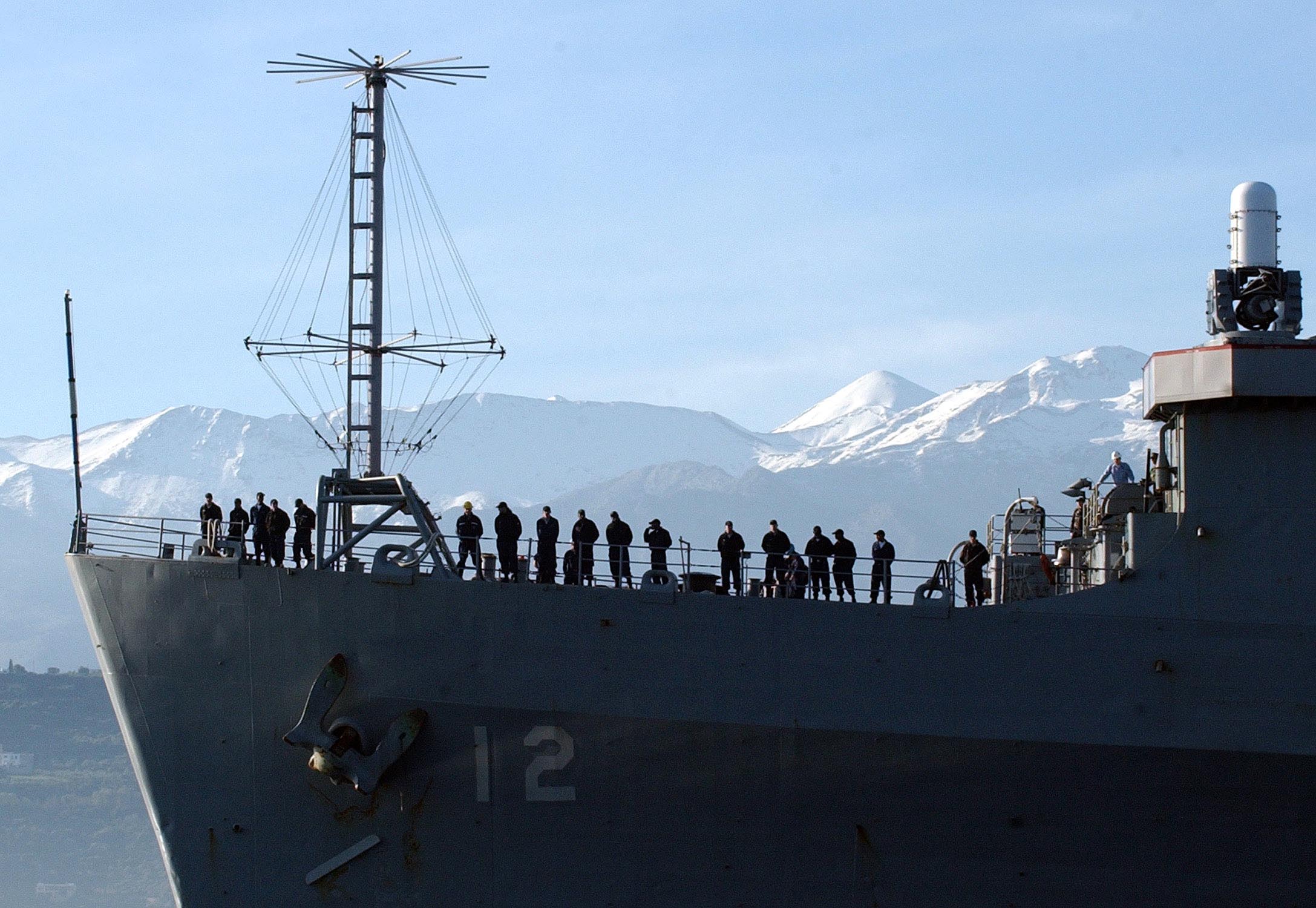 Souda Bay, Crete, Greece (Jan. 25, 2007) -- Sailors aboard amphibious transport dock USS Shreveport (LPD 12) stand ready to conduct mooring operations upon their arrival for a scheduled port visit. Shreveport is part of the Bataan Expeditionary Strike Group on deployment in support of maritime security operations (MSO) in both the 5th and 6th fleet areas of responsibility (AOR). U.S. Navy photo by Mr. Paul Farley (RELEASED)