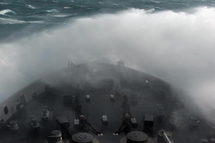 ATLANTIC OCEAN (March 6, 2008) -- Waves crash over the bow of the