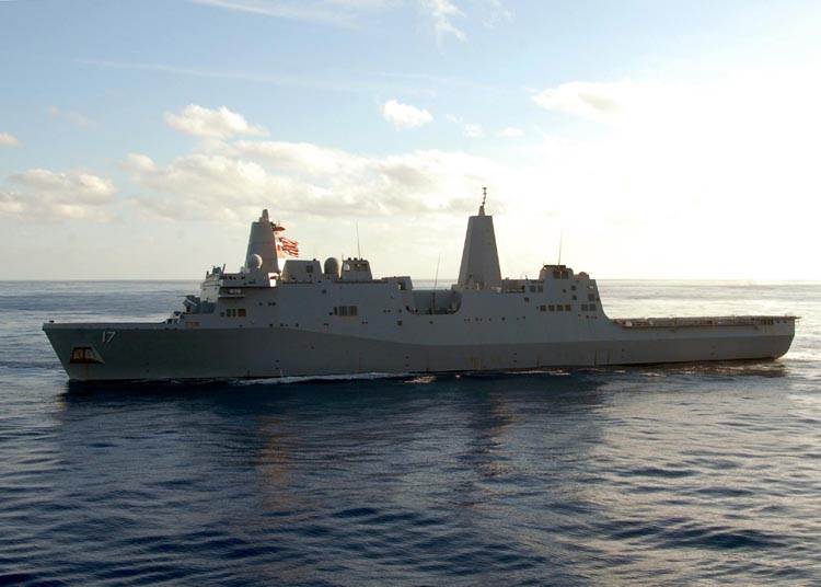ATLANTIC OCEAN (Sept. 6, 2008) -- The amphibious transport dock ship USS San Antonio (LPD 17) transits the Atlantic Ocean. San Antonio is deployed as part of the Iwo Jima Expeditionary Strike Strike Group, which is supporting maritime security operations in the U.S. Navy's 5th and 6th Fleet areas of responsibility. U.S. Navy photo by Mass Communication Specialist 2nd Class Katrina Parker (Released)