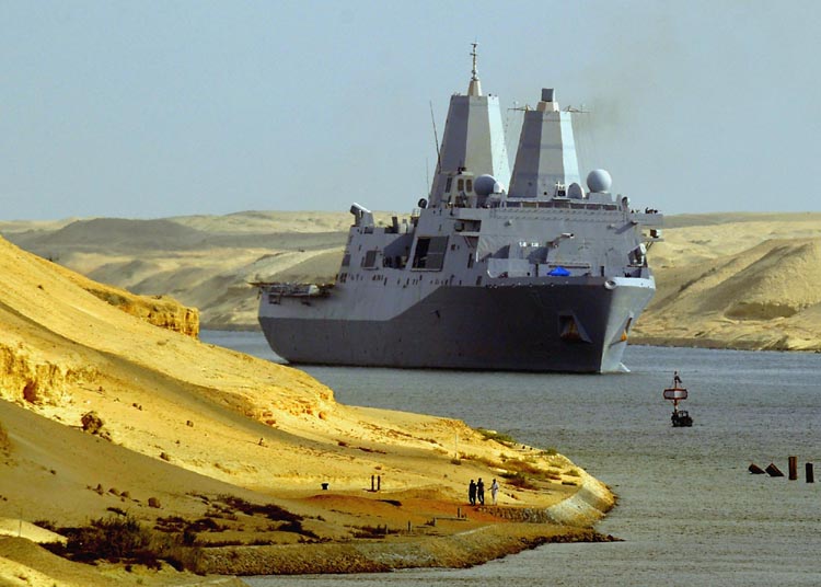 SUEZ CANAL, Egypt (Sept. 23, 2008) -- The amphibious transport dock ship USS San Antonio (LPD 17) transits through the Suez Canal. San Antonio is deployed as part of the Iwo Jima Expeditionary Strike Group supporting maritime security operations in the U.S. 5th Fleet area of responsibility. U.S. Navy photo by Mass Communication Specialist 2nd Class Jason R. Zalasky (Released)