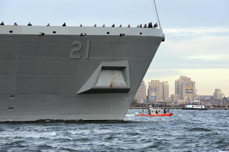York (LPD 21) into New York Harbor. The ship has 7.5 tons of steel