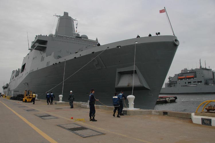 NORFOLK (Nov. 18, 2009) -- The amphibious transport dock ship USS New York (LPD 21) arrives at its homeport of Naval Station Norfolk for the first time since it was commissioned Nov. 7. New York will be used for amphibious assault, special operations, expeditionary warfare missions, and humanitarian support around the world. U.S. Navy photo by Mass Communication Specialist 2nd Class Rafael Martie (Released)