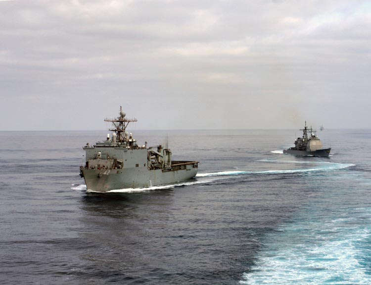 PACIFIC OCEAN (Sept. 17, 2007) -- Dock landing ship USS Germantown (LSD 42) and guided-missile cruiser USS Port Royal (CG 73), part of the amphibious assault ship USS Tarawa (LHA1) battle group, take evasive maneuvers in preparation for an upcoming deployment. Tarawa is participating in a composite unit training exercise with the 11th Marine Expeditionary Unit off the coast of Southern California. U.S. Navy photo by Mass Communication Specialist 3rd Class Bryan Niegel (RELEASED)