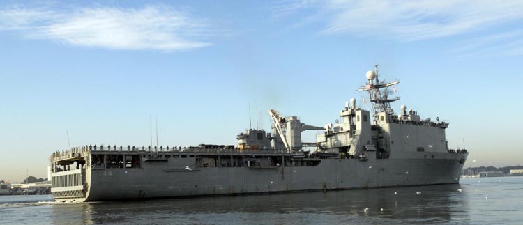 VIRGINIA BEACH, Va. (Jan. 15, 2010) -- Sailors and Marines man the rails of the Whidbey Island-class dock landing ship USS Gunston Hall (LSD 44), as the ship departs Joint Expeditionary Base Little Creek-Fort Story. Gunston Hall is deploying to Haiti to render humanitarian assistance after a 7.0 magnitude earthquake. U.S. Navy photo by Mass Communication Specialist 3rd Class John Suits (Released)
