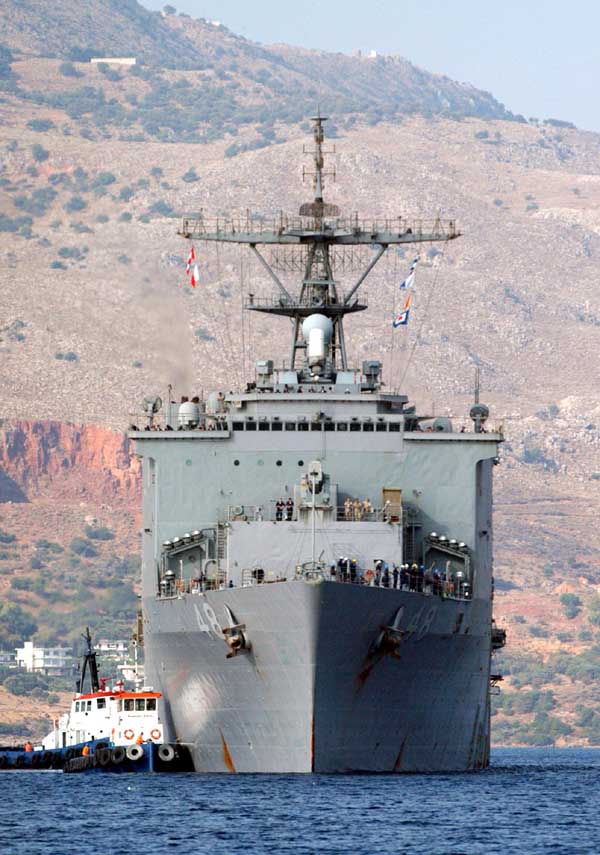 Souda Bay, Crete, Greece (Sep. 1, 2005) -- The dock landing ship USS Ashland (LSD 48) and embarked elements of 26th Marine Expeditionary Unit (MEU), arrive in Souda Harbor for a routine port visit on Greece's largest island. Ashland is assigned to the Kearsarge Expeditionary Strike Group and has been on a regular deployment from its homeport of Little Creek, Va., since March. U.S. Navy photo by Paul Farley (RELEASED)