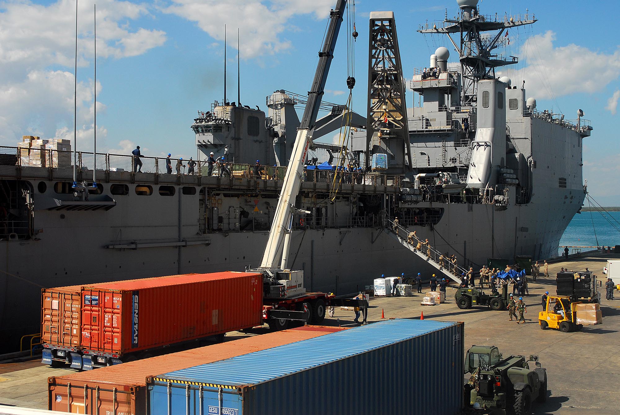 GUANTANAMO BAY, Cuba (Feb. 2, 2010) -- The amphibious dock-landing ship USS Ashland (LSD 48) takes on humanitarian supplies at Naval Station Guantanamo Bay. Guantanamo Bay is a logistical hub providing support for Operation Unified Response, a humanitarian assistance mission following a 7.0 magnitude earthquake that devastated the region. U.S. Navy photo by Mass Communication Specialist John K. Hamilton (Released)