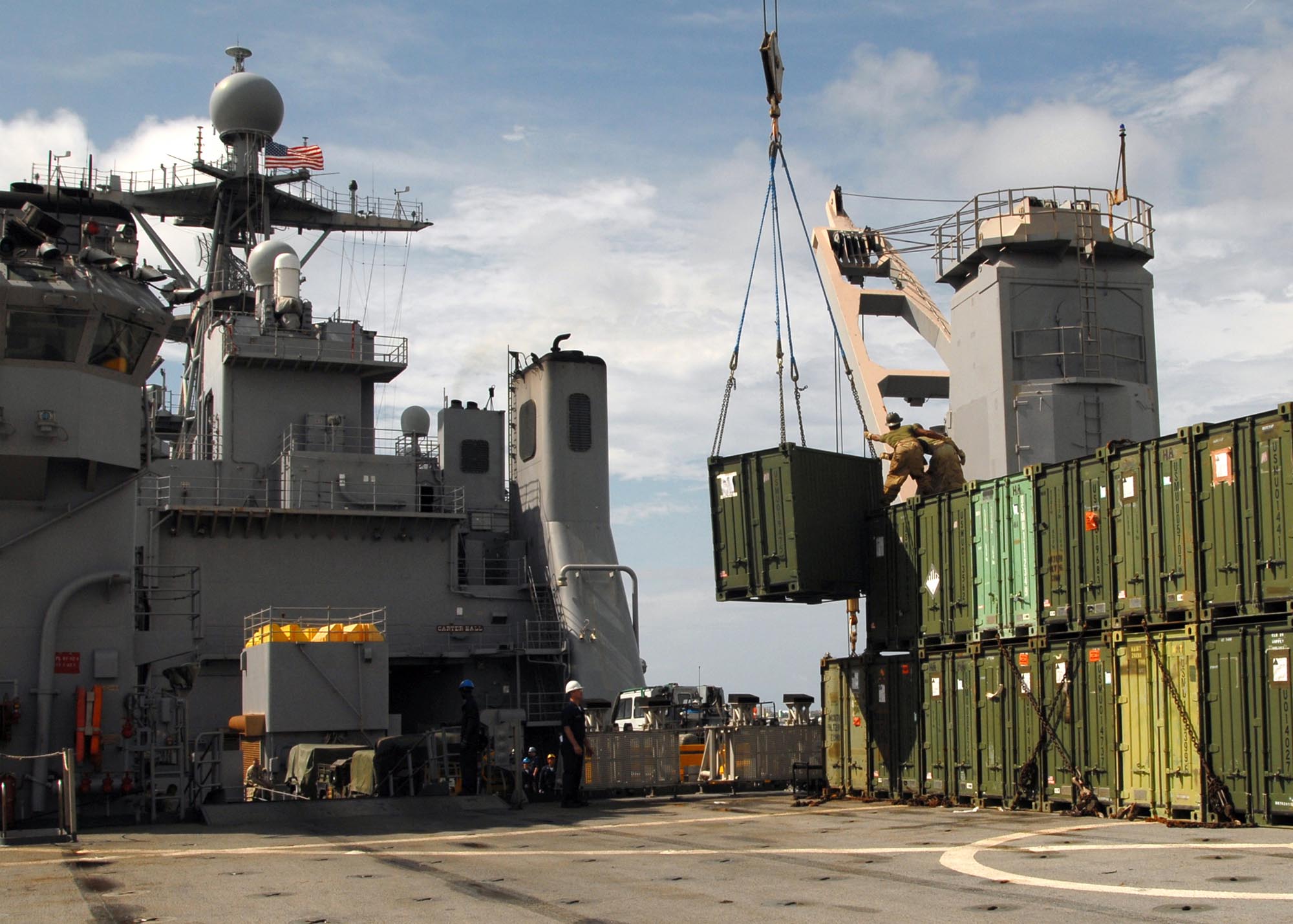 ATLANTIC OCEAN (Aug. 27, 2008) -- Sailors and Marines secure equipment from the 26th Marine Expeditionary Unit aboard the amphibious dock landing ship USS Carter Hall (LSD 50). Carter Hall is part of the Iwo Jima Expeditionary Strike Group en route to the U.S. 5th and 6th Fleet areas of responsibility supporting maritime security operations. U.S. Navy photo by Mass Communication Specialist 2nd Class Katrina Parker (Released)