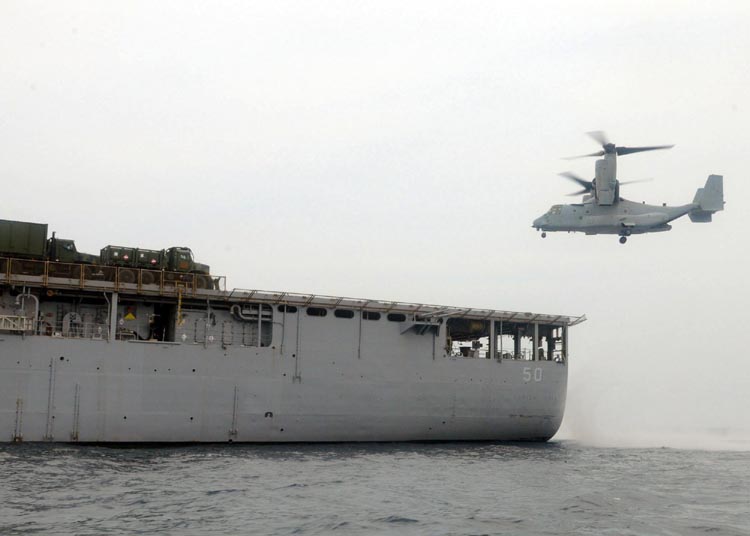 to land aboard the amphibious dock landing ship USS Carter Hall (LSD
