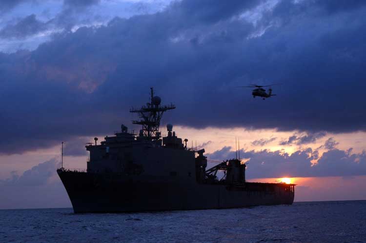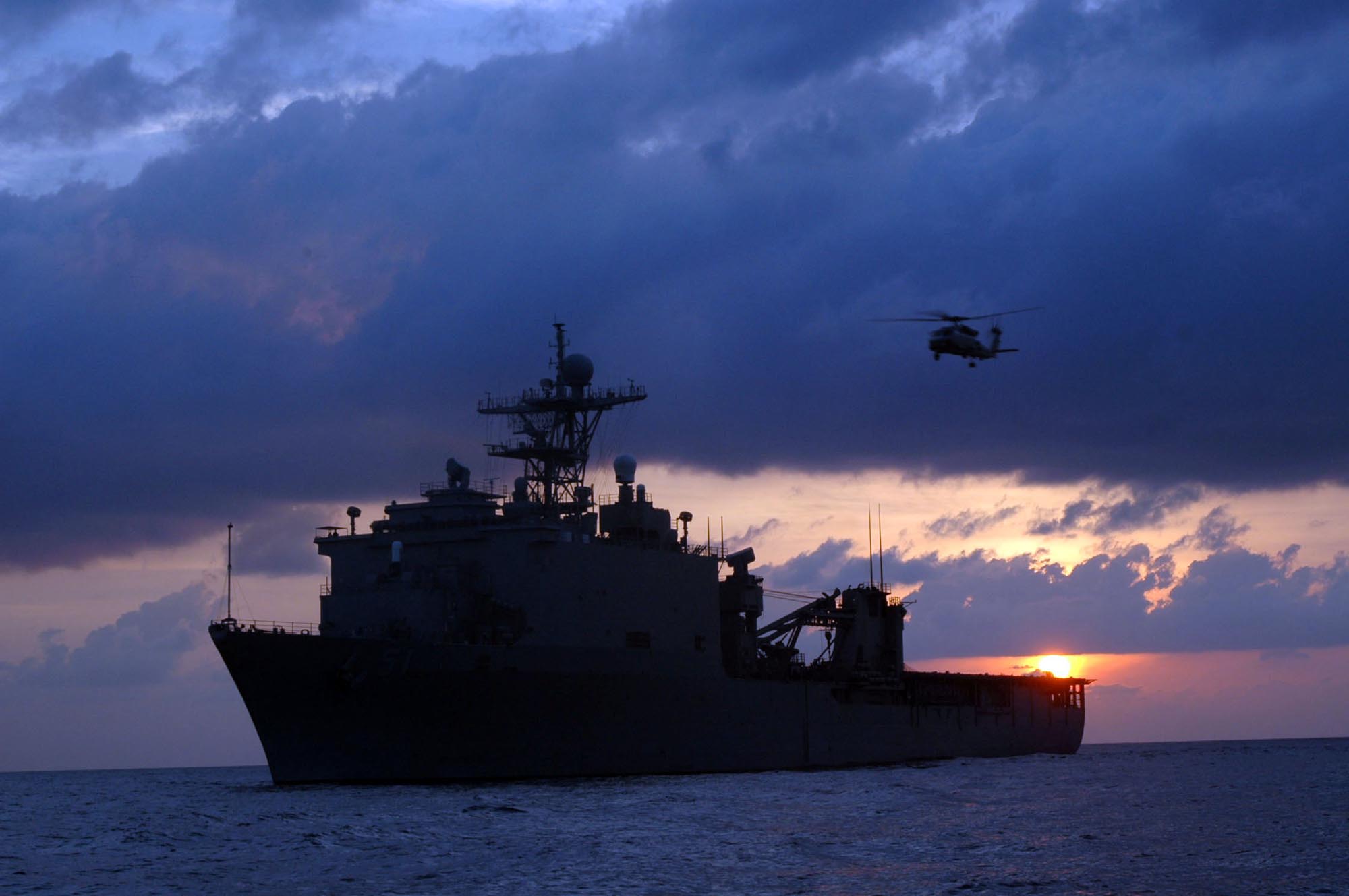 Indian Ocean (April 16, 2006) -- An SH-60B conducts an early morning fly-by of the amphibious dock landing ship USS Oak Hill (LSD 51). Oak Hill is currently underway in the Indian Ocean conducting Maritime Security Operations (MSO) in support of the global war on terrorism. U.S. Navy photo by Journalist 2nd Class Daniel K. Gay (RELEASED)